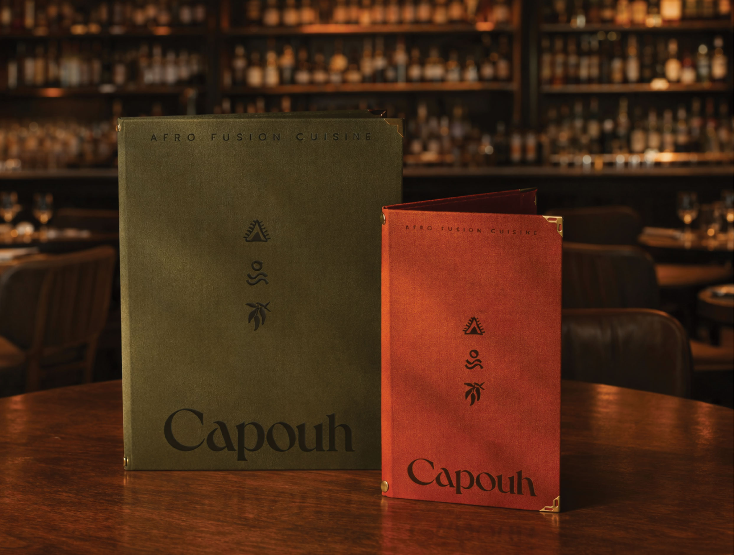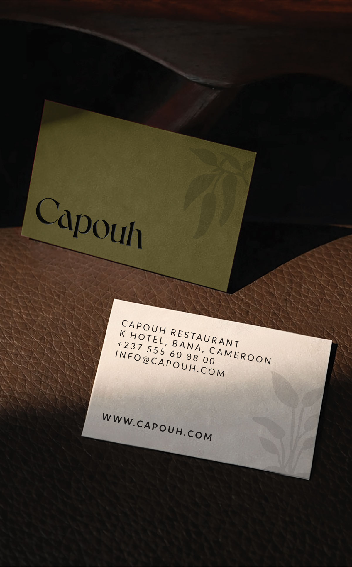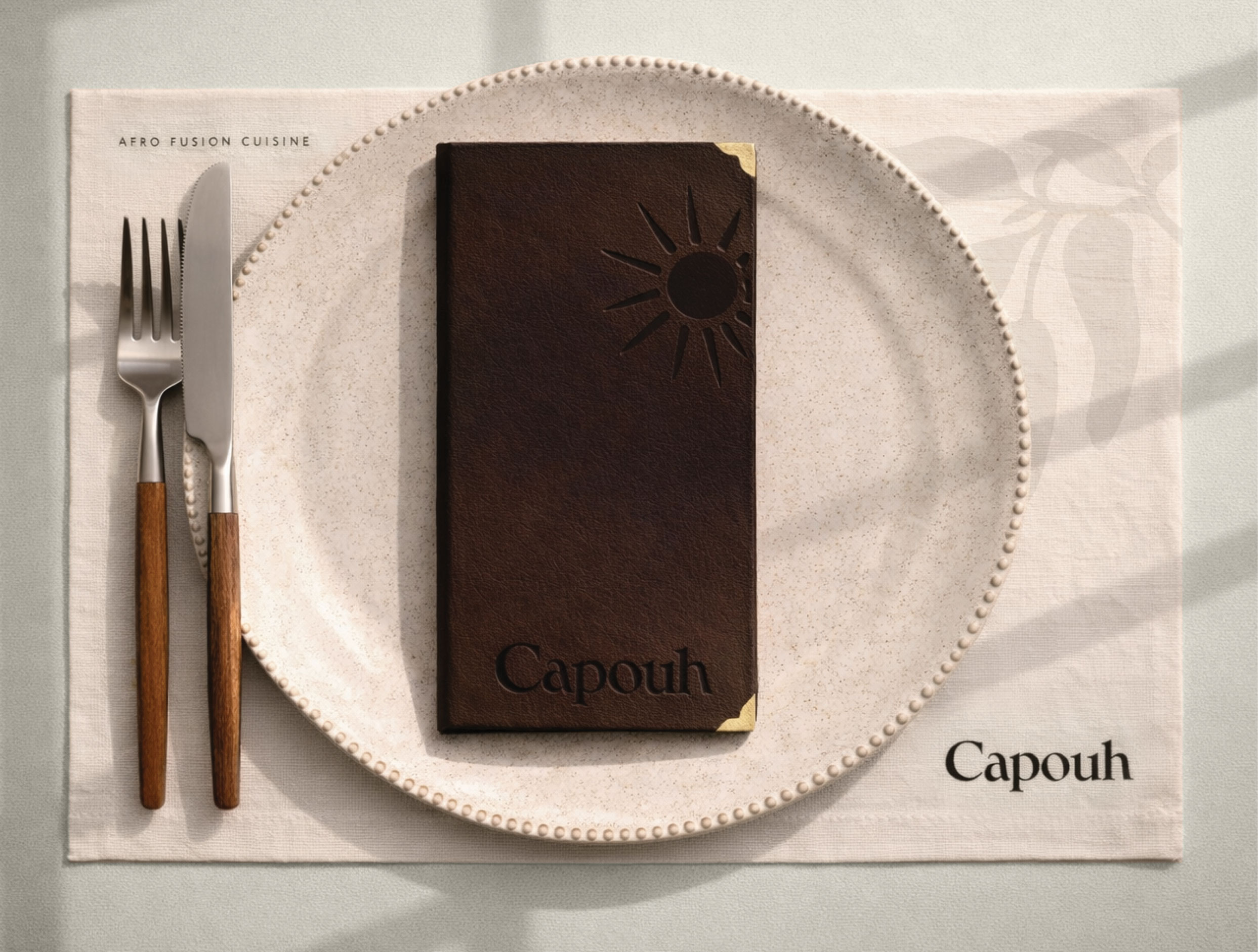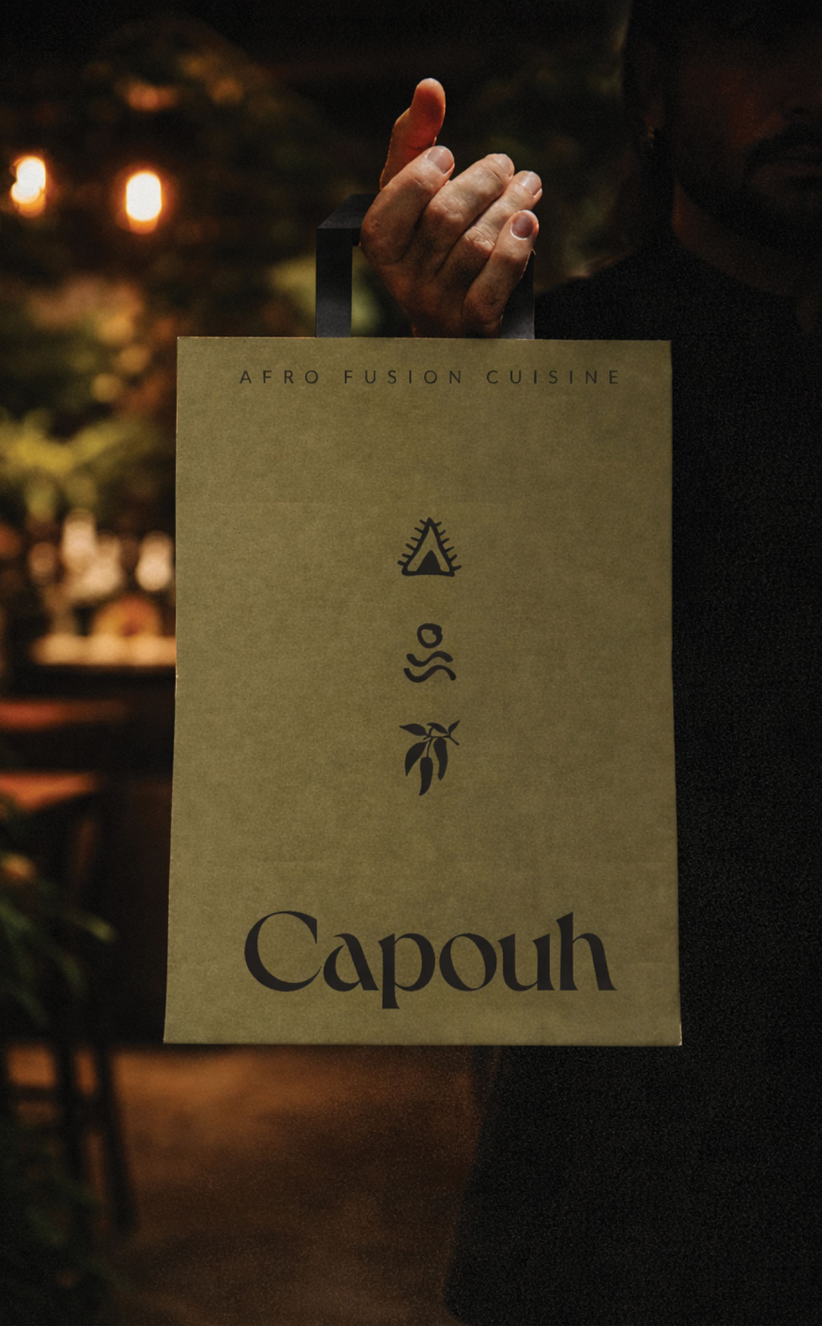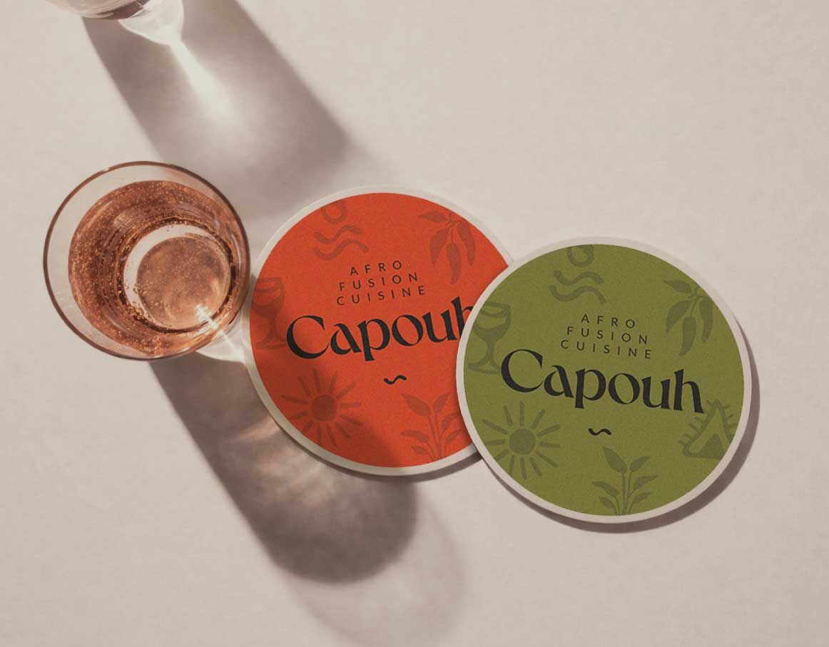 Capouh is a contemporary dining and social destination inspired by the African influences woven throughout the K-hotel interior in Bana, Cameroon. Conceived as a warm and grounded experience, the brand reflects a deep connection to place, culture, and nature. The identity begins with a refined serif logotype featuring a subtle dynamic twist, introducing character and modernity while preserving an elegant and timeless presence. The visual language draws from the surrounding landscape through a palette of stone, warm sienna, moss green, and earthy brown, evoking natural materials, fertile soil, and lush vegetation native to the region. Custom graphic elements with organic, hand-drawn strokes referencing regional ingredients, the sun, tropical greenery, and traditional African motifs create a layered visual system that feels both contemporary and culturally rooted.