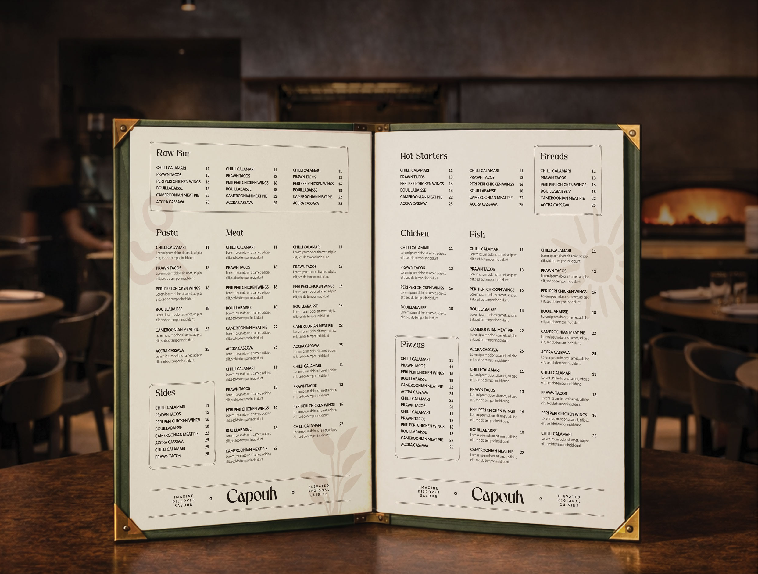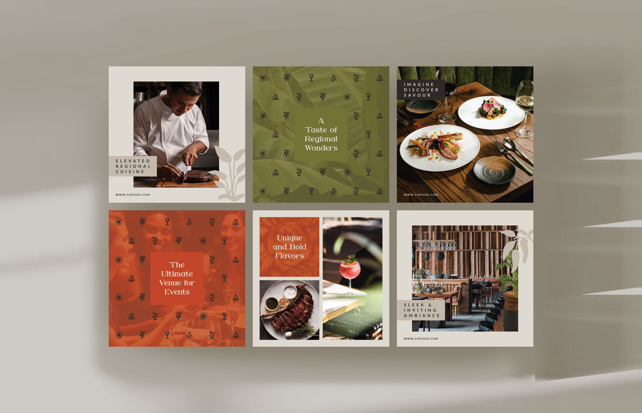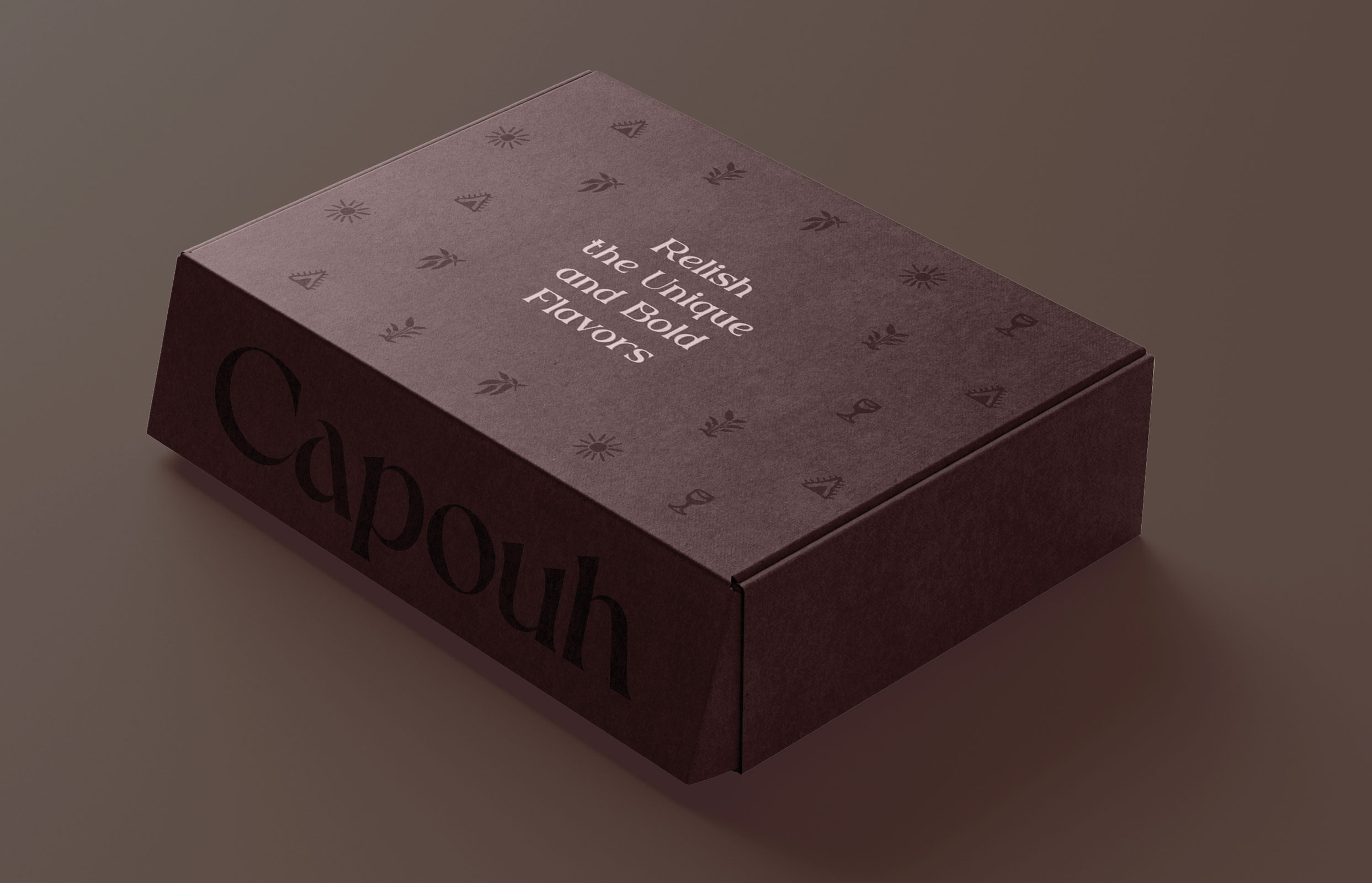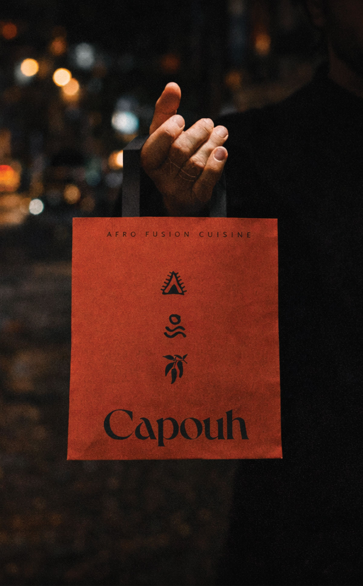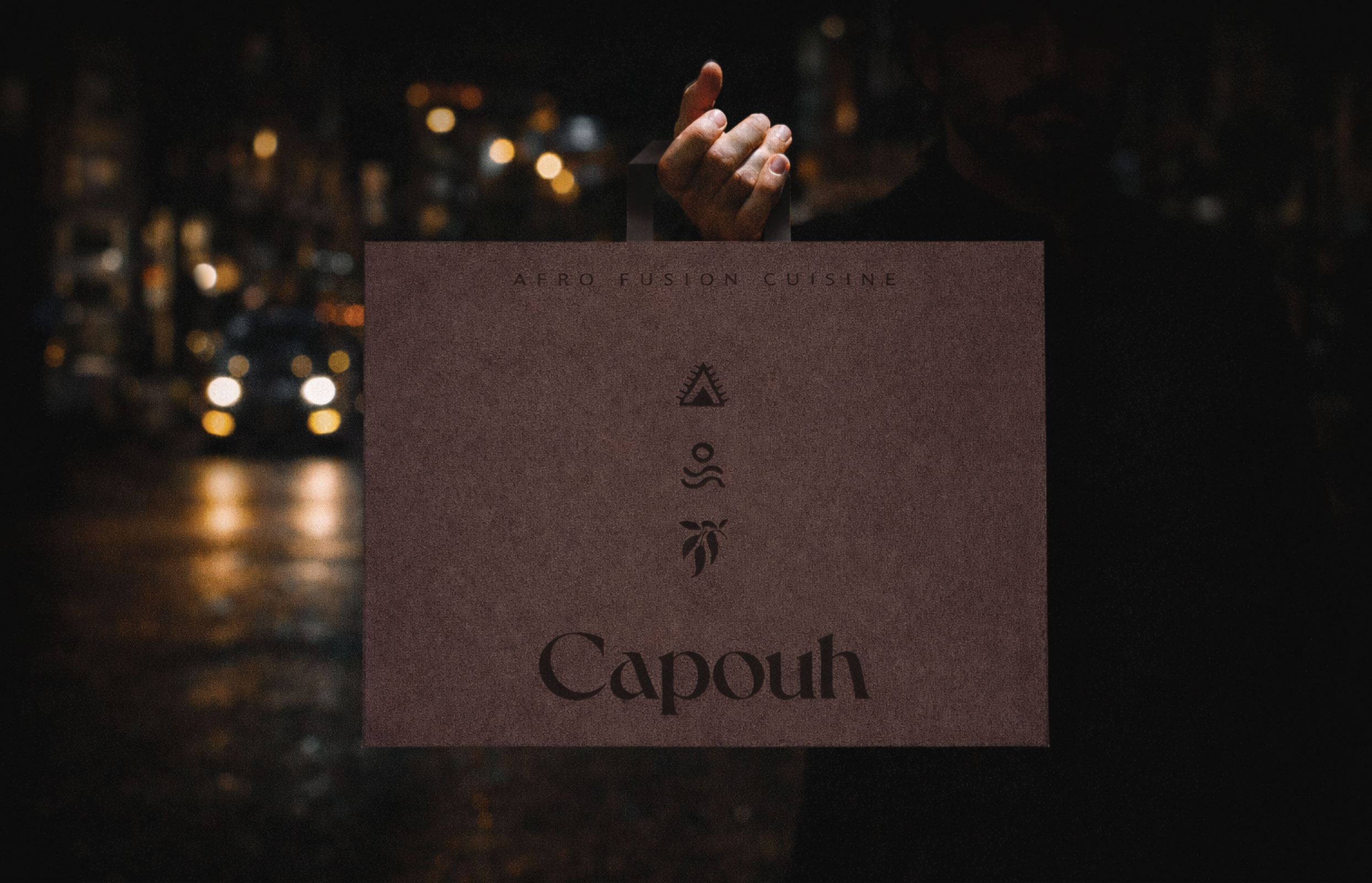 Capouh is a contemporary dining and social destination inspired by the African influences woven throughout the K-hotel interior in Bana, Cameroon. Conceived as a warm and grounded experience, the brand reflects a deep connection to place, culture, and nature. The identity begins with a refined serif logotype featuring a subtle dynamic twist, introducing character and modernity while preserving an elegant and timeless presence. The visual language draws from the surrounding landscape through a palette of stone, warm sienna, moss green, and earthy brown, evoking natural materials, fertile soil, and lush vegetation native to the region. Custom graphic elements with organic, hand-drawn strokes referencing regional ingredients, the sun, tropical greenery, and traditional African motifs create a layered visual system that feels both contemporary and culturally rooted.